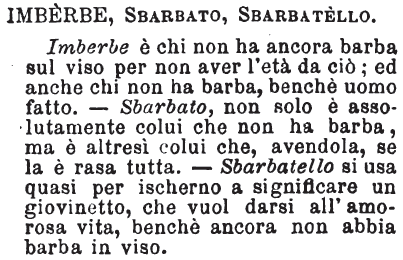 | Imberbe, Sbarbato, Sbarbatello - Imberbe è chi non ha ancora barba sul viso per non aver l'età da ciò; ed anche chi non ha barba, benchè uomo fatto. - Sbarbato, non solo è assolutamente colui che non ha barba, ma è altresì colui che, avendola, se la è rasa tutta. - Sbarbatello si usa quasi per ischerno a significare un giovinetto, che vuol darsi all'amorosa vita, benchè ancora non abbia barba in viso. [immagine] |