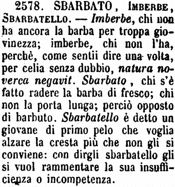 | Sbarbato, Imberbe, Sbarbatello - Imberbe, chi non ha ancora la barba per troppa giovinezza; imberbe, chi non l'ha, perchè, come sentii dire una volta, per celia senza dubbio, natura noverca negavit. Sbarbato, chi s'è fatto radere la barba di fresco; chi non la porta lunga; perciò opposto di barbuto. Sbarbatello è detto un giovane di primo pelo che voglia alzare la cresta più che non gli si conviene: con dirgli sbarbatello gli si vuol rammentare la sua insufficienza o incompetenza. [immagine] |