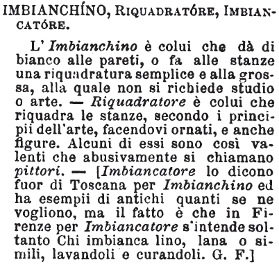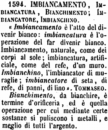 | Imbiancamento, Imbiancatura, Bianchimento; Imbiancatore, Imbianchino - «Imbiancamento è l'atto del divenir bianco: imbiancatura è l'operazione del far divenir bianco. Imbiancamento, naturale, come dei corpi al sole; imbiancatura, artificiale, come del refe, d'un muro. Imbianchino, l'imbiancator di muraglie; imbiancatore di seta, di refe, di panni, di lino». Tommaseo.