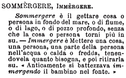| Sommergere, Immergere - Sommergere è il gettare cosa o persona in fondo del mare, o di fiume, o di lago, o di pozzo profondo, senza che la cosa o persona torni più in su. - Immergere è Mettere una cosa, una persona, una parte della persona nell'acqua o calda o fredda, tenendovela quanto bisogna, e poi ritirarla su. «Anticamente si battezzava immergendo il bambino nel fonte.» [immagine] |