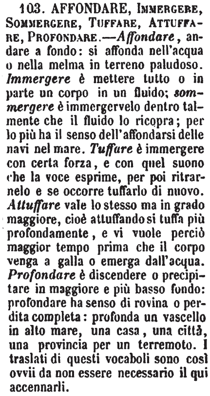 | Affondare, Immergere, Sommergere, Tuffare, Attuffare, Profondare - Affondare, andare a fondo: si affonda nell'acqua o nella melma in terreno paludoso. Immergere è mettere tutto o in parte un corpo in un fluido; sommergere è immergervelo dentro talmente che il fluido lo ricopra; per lo più ha il senso dell'affondarsi delle navi nel mare. Tuffare è immergere con certa forza, e con quel suono che la voce esprime, per poi ritrarnelo e se occorre tuffarlo di nuovo. Attuffare vale lo stesso ma in grado maggiore, cioè attuffando si tuffa più profondamente, e vi vuole perciò maggior tempo prima che il corpo venga a galla o emerga dall'acqua. Profondare è discendere o precipitare in maggiore e più basso fondo: profondare ha senso di rovina o perdita completa: profonda un vascello in alto mare, una casa, una città, una provincia per un terremoto. I traslati di questi vocaboli sono così ovvii da non essere necessario il qui accennarli. [immagine] |