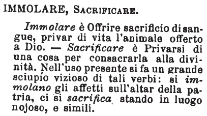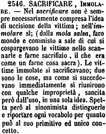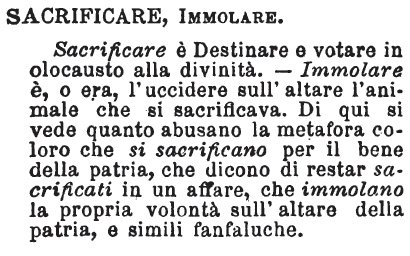 | Sacrificare, Immolare - Sacrificare è Destinare e votare in olocausto alla divinità. - Immolare è, o era, l'uccidere sull'altare l'animale che si sacrificava. Di qui si vede quanto abusano la metafora coloro che si sacrificano per il bene della patria, che dicono di restar sacrificati in un affare, che immolano la propria volontà sull'altare della patria, e simili fanfaluche. [immagine] |