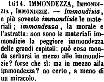 | Immondezza, Immondizia, Immondizie - Immondizia, e più sovente immondizie le materiali; immondezza, la morale e l'astratta: non sono le materiali immondizie la peggiore immondezza delle grandi capitali: può cosa monda serbarsi in mezzo alle immondizie? forse che sì: ma in mezzo alla immondezza? no certo, a meno di un miracolo. [immagine] |
