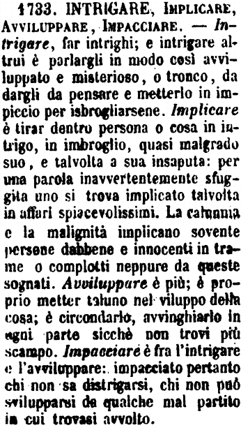 | Intrigare, Implicare, Avviluppare, Impacciare - Intrigare, far intrighi; e intrigare altrui è parlargli in modo così avviluppato e misterioso, o tronco, da dargli da pensare e metterlo in impiccio per isbrogliarsene. Implicare è tirar dentro persona o cosa in intrigo, in imbroglio, quasi malgrado suo, e talvolta a sua insaputa: per una parola inavvertentemente sfuggita uno si trova implicato talvolta in affari spiacevolissimi. La calunnia e la malignità implicano sovente persone dabbene e innocenti in trame o complotti neppure da queste sognati. Avviluppare è più; è proprio metter taluno nel viluppo della cosa; è circondarlo, avvinghiarlo in ogni parte sicchè non trovi più scampo. Impacciare è fra l'intrigare e l'avviluppare: impacciato pertanto chi non sa distrigarsi, chi non può svilupparsi da qualche mal partito in cui trovasi avvolto. [immagine] |