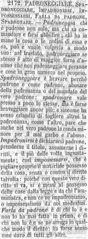 | Padroneggiare, Spadroneggiare, Impadronirsi, Impossessarsi, Farla da padrone, Spadronare - Padroneggia chi è padrone non solo, ma chi sa comandare e farsi ubbidire; chi ha in mano la cosa o le redini di essa e sa, può e vuole volgerla a modo suo: nel traslato, padroneggiare se stesso è atto di maggior forza d'animo che non padroneggiare persone e cose in gran numero nel proprio. Spadroneggiare è bravare perchè padrone e come padrone, abusare della padronanza o del mandato del vero padrone: spadronare vale presso a poco lo stesso, ma è forse braveggiare ancor più; e siccome ha senso eziandio di togliere altrui la padronanza, come l'altro, pare che anche nel vero padrone la renda minore per il mal garbo e l'abuso. Impadronirsi è dichiararsi padrone, prenderne il titolo, assumerne i diritti, e il più delle volte ingiustamente; così impossessarsi, che è pigliare proprio il materiale possesso della cosa, senza o contro il diritto talvolta: poichè con questo vero diritto si va, si è messi al possesso delle cose dalla legge e da chi l'amministra, e non ce ne impadroniamo, o impossessiamo da noi medesimi. Farla da padrone è di chi lo è e non lo ha mai fatto in prima, o di chi non lo è e se ne arroga in qualche modo il diritto: ha forse senso men duro di tutti gli altri. [immagine] |