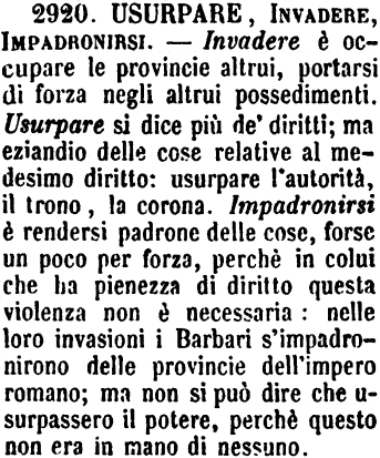 | Usurpare, Invadere, Impadronirsi - Invadere è occupare le provincie altrui, portarsi di forza negli altrui possedimenti. Usurpare si dice più de' diritti; ma eziandio delle cose relative al medesimo diritto; usurpare l'autorità, il trono, la corona. Impadronirsi è rendersi padrone delle cose, forse un poco per forza, perchè in colui che ha pienezza di diritto questa violenza non è necessaria: nelle loro invasioni i Barbari s'impadronirono delle provincie dell'impero romano; ma non si può dire che usurpassero il potere, perchè questo non era in mano a nessuno. [immagine] |