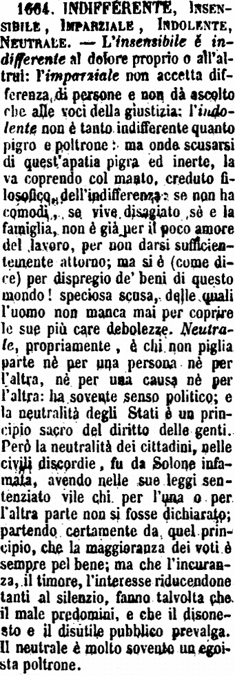 | Indifferente, Insensibile, Imparziale, Indolente, Neutrale - L'insensibile è indifferente al dolore proprio o all'altrui: l'imparziale non accetta differenza di persone e non dà ascolto che alle voci della giustizia: l'indolente non è tanto indifferente quanto pigro e poltrone: ma onde scusarsi di quest'apatia pigra ed inerte, la va coprendo col manto, creduto filosofico, dell'indifferenza: se non ha comodi, se vive disagiato sè e la famiglia, non è già per il poco amore del lavoro, per non darsi sufficientemente attorno; ma si è (come dice) per dispregio de' beni di questo mondo! speciosa scusa, delle quali l'uomo non manca mai per coprire le sue più care debolezze. Neutrale, propriamente, è chi non piglia parte nè per una persona nè per l'altra, nè per una causa nè per l'altra: ha sovente senso politico; e la neutralità degli Stati è un principio sacro del diritto delle genti. Però la neutralità dei cittadini, nelle civili discordie, fu da Solone infamata, avendo nelle sue leggi sentenziato vile chi per l'una o per l'altra parte non si fosse dichiarato; partendo certamente da quel principio, che la maggioranza dei voti è sempre pel bene; ma che l'incuranza, il timore, l'interesse riducendone tanti al silenzio, fanno talvolta che il male predomini, e che il disonesto e il disutile pubblico prevalga. Il neutrale è molto sovente un egoista poltrone. [immagine] |