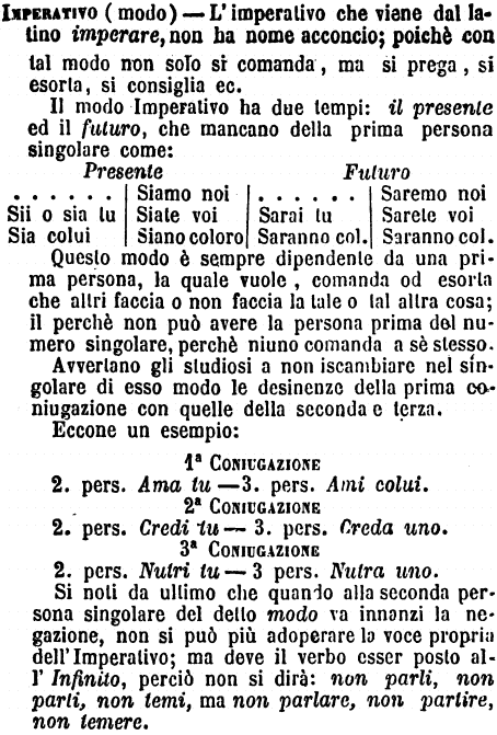 | Imperativo (modo) - L'imperativo che viene dal latino imperare, non ha nome acconcio; poichè con tal modo non solo si comanda, ma si prega, si esorta, si consiglia ec.