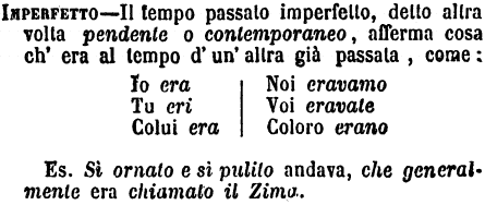 | Imperfetto - Il tempo passato imperfetto, detto altra volta pendente o contemporaneo, afferma cosa ch'era al tempo d'un'altra già passata, come: