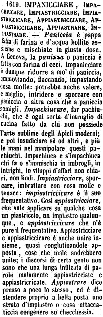 | Impanicicare, Impachiucare, Impiastricciare, Impiastriccicare, Appiastricciare, Appiastriccicare, Appiastrare, Impiastrare - Paniccia è pappa fatta di farina e d'acqua bollite assieme e mischiate in giusta dose. A Genova, la panizza o paniccia è fatta con farina di ceci. Impanicciare è dunque ridurre a mo' di paniccia, ammottando, fiaccando, impastando cosa molle: potrebbe anche valere, e meglio, intridere e sporcare con paniccia o altra cosa che a paniccia somigli. Impachiucare, far pachiuchi, che è ogni sorta d'intruglio di cucina fatto da chi non possiede l'arte sublime degli Apicii moderni; e poi insudiciare sè od altri, e più le mani nel manipolare questi pachiuchi. Impachiuca e s'impachiuca chi fa o s'immischia in imbrogli, in intrighi, in viluppi d'affari non chiari, non lindi. Impiastricciare, sporcare, imbrattare con cosa molle e tenace: impiastriccicare è il suo frequentativo. Così appiastricciare, che vale applicare su qualche cosa un piastriccio, un impiastro qualunque, e appiastriccicare che n'è pure il frequentativo. Appiastricciare e appiastriccicare è anche unire insieme, quasi conglutinandole apposta, cose che male andrebbero unite; i discorsi di certa gente non sono che una lunga infilzata di parole malamente appiastricciate e appiastriccicate. Appiastrare dice presso a poco lo stesso, ed è distendere proprio a bella posta uno strato d'impiastro o cosa attaccaticcia congenere su checchessia. [immagine] |