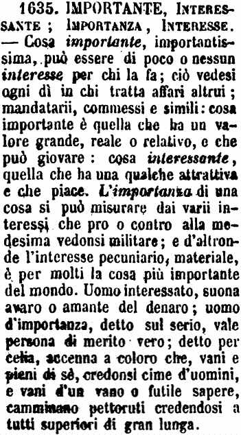 | Importante, Interessante; Importanza, Interesse - Cosa importante, importantissima, può essere di poco o nessun interesse per chi la fa; ciò vedesi ogni dì in chi tratta affari altrui; mandatarii, commessi e simili: cosa importante è quella che ha un valore grande, reale o relativo, e che può giovare: cosa interessante, quella che ha una qualche attrattiva e che piace. L'importanza di una cosa si può misurare dai varii interessi che pro o contro alla medesima vedonsi militare; e d'altronde l'interesse pecuniario, materiale, è per molti la cosa più importante del mondo. Uomo interessato, suona avaro o amante del denaro; uomo d'importanza, detto sul serio, vale persona di merito vero; detto per celia, accenna a coloro che, vani e pieni di sè, credonsi cime d'uomini, e vani d'un vano o futile sapere, camminano pettoruti credendosi a tutti superiori di gran lunga. [immagine] |