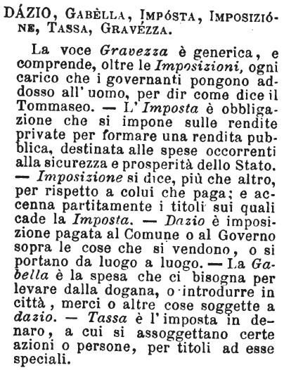 | Dazio, Gabella, Imposta, Imposizione, Tassa, Gravezza - La voce Gravezza è generica, e comprende, oltre le Imposizioni, ogni carico che i governanti pongono addosso all'uomo, per dir come dice il Tommaseo. - L'Imposta è obbligazione che si impone sulle rendite private per formare una rendita pubblica, destinata alle spese occorrenti alla sicurezza e prosperità dello stato. - Imposizione si dice, più che altro, per rispetto a colui che paga; e accenna partitamente i titoli sui quali cade la Imposta. - Dazio è imposizione pagata al Comune o al Governo sopra le cose che si vendono, o si portano da luogo a luogo. - La Gabella è la spesa che ci bisogna per levare dalla dogana, o introdurre in città, merci o altre cose soggette a dazio. - Tassa è l'imposta in denaro, a cui si assoggettano certe azioni o persone, per titoli ad esse speciali. [immagine] |