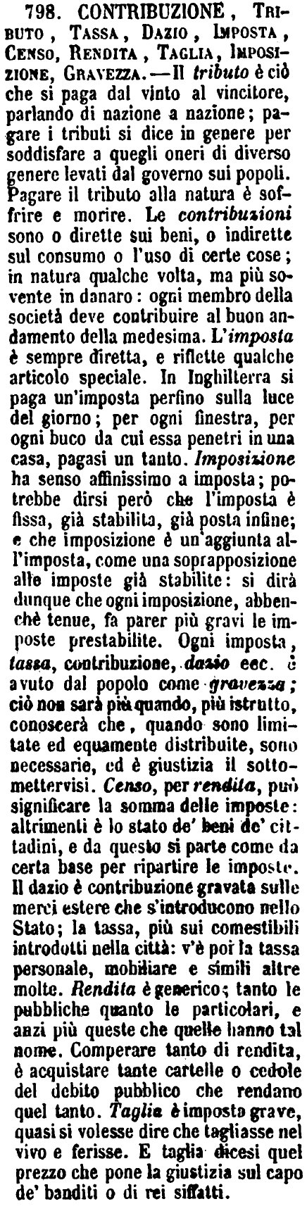 | Contribuzione, Tributo, Tassa, Dazio, Imposta, Censo, Rendita, Taglia, Imposizione, Gravezza - Il tributo è ciò che si paga dal vinto al vincitore, parlando di nazione a nazione; pagare i tributi si dice in genere per soddisfare a quegli oneri di diverso genere levati dal governo sui popoli. Pagare il tributo alla natura è soffrire e morire. Le contribuzioni sono o dirette sui beni, o indirette sul consumo o l'uso di certe cose; in natura qualche volta, ma più sovente in danaro: ogni membro della società deve contribuire al buon andamento della medesima. L'imposta è sempre diretta, e riflette qualche articolo speciale. In Inghilterra si paga un'imposta perfino sulla luce del giorno; per ogni finestra, per ogni buco da cui essa penetri in una casa, pagasi un tanto. Imposizione ha senso affinissimo a imposta; potrebbe dirsi però che l'imposta è fissa, già stabilita, già posta infine; e che imposizione è un'aggiunta all'imposta, come una soprapposizione alle imposte già stabilite: si dirà dunque che ogni imposizione, abbenchè tenue, fa parer più gravi le imposte prestabilite. Ogni imposta, tassa, contribuzione, dazio ecc. è avuto dal popolo come gravezza; ciò non sarà più quando, più istrutto, conoscerà che, quando sono limitate ed equamente distribuite, sono necessarie, ed è giustizia il sottomettervisi. Censo, per rendita, può significare la somma delle imposte: altrimenti è lo stato de' beni de' cittadini, e da questo si parte come da certa base per ripartire le imposte. Il dazio è contribuzione gravata sulle merci estere che s'introducono nello Stato; la tassa, più sui comestibili introdotti nella città: v'è poi la tassa personale, mobiliare e simili altre molte. Rendita è generico; tanto le pubbliche quanto le particolari, e anzi più queste che quelle hanno tal nome. Comperare tanto di rendita, è acquistare tante cartelle o cedole del debito pubblico che rendano quel tanto. Taglia è imposta grave, quasi si volesse dire che tagliasse nel vivo e ferisse. E taglia dicesi quel prezzo che pone la giustizia sul capo de' banditi o di rei siffatti. [immagine] |