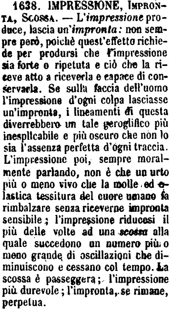 Impressione, Impronta, Scossa - L'impressione produce, lascia un'impronta: non sempre però, poichè quest'effetto richiede per prodursi che l'impressione sia forte o ripetuta e ciò che la riceve atto a riceverla e capace di conservarla. Se sulla faccia dell'uomo l'impressione d'ogni colpa lasciasse un'impronta, i lineamenti di questa diverrebbero un tale geroglifico più inesplicabile e più oscuro che non lo sia l'assenza perfetta d'ogni traccia. L'impressione poi, sempre moralmente parlando, non è che un urto più o meno vivo che la molle ed elastica tessitura del cuore umano fa rimbalzare senza riceverne impronta sensibile; l'impressione riducesi il più delle volte ad una scossa alla quale succedono un numero più o meno grande di oscillazioni che diminuiscono e cessano col tempo. La scossa è passeggera; l'impressione più durevole; l'impronta, se rimane, perpetua. [immagine]