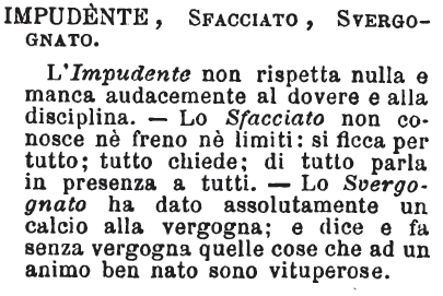 | Impudente, Sfacciato, Svergognato - L'Impudente non rispetta nulla e manca audacemente al dovere e alla disciplina. - Lo Sfacciato non conosce nè freno nè limiti: si ficca per tutto; tutto chiede; di tutto parla in presenza a tutti. - Lo Svergognato ha dato assolutamente un calcio alla vergogna; e dice e fa senza vergogna quelle cose che ad un animo ben nato sono vituperose. [immagine] |
