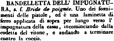 | Bandelletta dell'impugnatura - s. f. Bride de poignée. Uno dei fornimenti delle pistole, ed è una laminetta di ferro applicata di sopra per lungo verso l'impugnatura della cassa, incominciando dalla codetta del vitone, e andando a terminare contro la coccia. [immagine] |