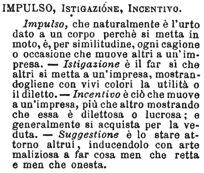 | Impulso, Istigazione, Incentivo - Impulso, che naturalmente è l'urto dato a un corpo perchè si metta in moto, è, per similitudine, ogni cagione o occasione che muove altri a un'impresa. - Istigazione è il far sì che altri si metta a un'impresa, mostrandogliene con vivi colori la utilità o il diletto. - Incentivo è ciò che muove a un'impresa, più che altro mostrando che essa è dilettosa o lucrosa; e generalmente si acquista per la veduta. - Suggestione è lo stare attorno altrui, inducendo con arte maliziosa a far cosa men che retta e men che onesta. [immagine] |