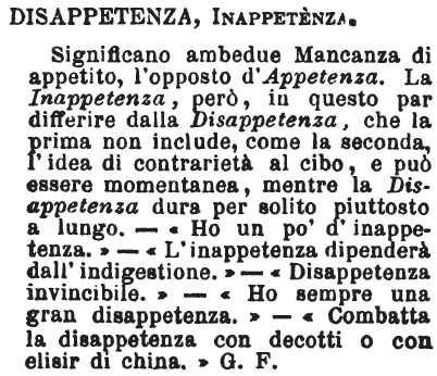 | Disappetenza, Inappetenza - Significano ambedue Mancanza di appetito, l'opposto d'Appetenza. La Inappetenza, però, in questo par differire dalla Disappetenza, che la prima non include, come la seconda, l'idea di contrarietà al cibo, e può essere momentanea, mentre la Disappetenza dura per solito piuttosto a lungo. - « Ho un po' d'inappetenza. » - « L'inappetenza dipenderà dall'indigestione. » - « Disappetenza invincibile. » - « Ho sempre una gran disappetenza. » - « Combatta la disappetenza con decotti o con elisir di china. » G. F. [immagine] |