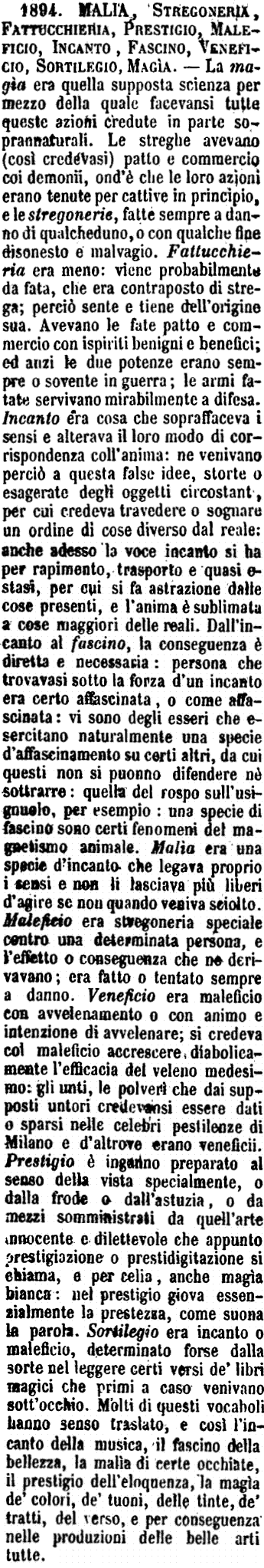 | Fattucchiera, Stregoneria, Malia, Fascino, Incanto - Fattucchieria sono quelle vane cerimonie che fanno coloro i quali pretendono di predire il futuro e di vincere l'ordine della natura, per virtù di una forza arcana. - Malía è il produrre, per via di incanti, qualche impedimento, o anche qualche malattia, o strano effetto in qualche persona, in modo che non sia più libera della sua volontà. - Stregoneria sono atti e vane cerimonie che fanno gli stregoni o le streghe, cioè quegli imbroglioni che dánno ad intendere di vincere per essa l'ordine della natura: guarire malattie e simili cose. - Fascino è voce, più che altro, di erudizione, ed è l'effetto di una malía che si suppone presa guardando; e però si usa metaforicamente a significare ciò che opera potentemente sull'animo nostro, sopraffacendolo e tirandolo a sè. - L'Incanto si fa per via di parole. [immagine] |