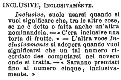 | Inclusive - Avv. di forma pretta lat. Corrisponde a Compresovi. T. Legg. Tosc. 67. I confini inclusive di Vicopisano come acquapende in verso Arno…, e dipoi passando il Serchio come acquapende, e includendo i confiui. [Camp.] Macc. Vit. S. Cat. Legg. abbrev. Perocchè agevolmente non si potrebbe narrare quante fatiche, sudori, dolori, lagrime, infermità e passioni ed altre tempeste per modo di parlare inaudite, le quali esse portò e sostenne infino alla morte inclusive per la salute dell'anime… = Stat. Ord. S. Stef. 121. (Gh.) Dal giovedì grasso innanzi al carnovale sino al dì delle Ceneri inclusive. Dal sabbato innanzi alle Palme sino all'ottava di Pasqua inclusive. Magal. Var. operet. 292. Senza parlare di quelle (terre o majoliche) di Faenza, di Genova e di Savona e di tant'altre, insino a quelle di Monte Lupo inclusive. T. G. Gozz. Si assegnino cinque ore di studio per dì, tre la mattina, due tra il giorno, fino alla scuola d'eloquenza inclusive.
