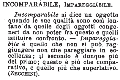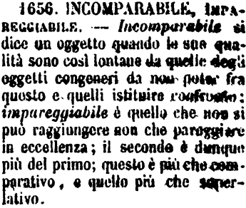 | Incomparabile, Impareggiabile - Incomparabile si dice un oggetto quando le sue qualità sono così lontane da quelle degli oggetti congeneri da non poter fra questo e quelli istituire confronto; impareggiabile è quello che non si può raggiungere non che pareggiare in eccellenza; il secondo è dunque più del primo; questo è più che comparativo, e quello più che superlativo. [immagine] |