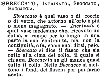 | Sbreccato, Incrinato, Sboccato, Boccaccia - Sbreccato è quel vaso o di coccio o di vetro, che attorno all'orlo è più o meno magagnato. - Incrinato è quel vaso medesimo che, ricevuto un colpo, si rompe per lo lungo in una parte la sua continuità, ma non la contiguità, e fa, come suol dirsi, pelo. - Sboccato si dice il fiasco che sia rotto alla cima del collo, il quale si chiama Boccaccia se gli manca quasi tutto il collo. Nelle Boccacce si mettono i fondi dei fiaschi per poi farne aceto. [immagine] |