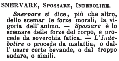 | Snervare, Spossare, Indebolire - Snervare si dice, più che altro, dello scemar le forze morali, la vigoria dell'animo. - Spossare è lo scemare delle forze del corpo, e procede da soverchia fatica. - L'Indebolire o procede da malattia, o dall'usare certe bevande, o dal troppo sudare, o simili. [immagine] |