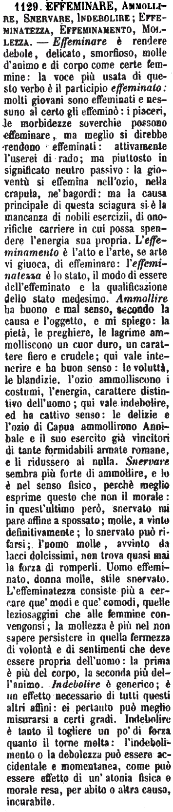 | Effeminare, Ammollire, Snervare, Indebolire; Effeminatezza, Effeminamento, Mollezza - Effeminare è rendere debole, delicato, smorfioso, molle d'animo e di corpo come certe femmine: la voce più usata di questo verbo è il participio effeminato: molti giovani sono effeminati e nessuno al certo gli effeminò: i piaceri, le morbidezze soverchie possono effeminare, ma meglio si direbbe rendono effeminati: attivamente l'userei di rado; ma piuttosto in significato neutro passivo: la gioventù si effemina nell'ozio, nella crapula, ne' bagordi: ma la causa principale di questa sciagura si è la mancanza di nobili esercizii, di onorifiche carriere in cui possa spendere l'energia sua propria. L'effeminamento è l'atto e l'arte, se arte vi giuoca, di effeminare: l'effeminatezza è lo stato, il modo di essere dell'effeminato e la qualificazione dello stato medesimo. Ammollire ha buono e mal senso, secondo la causa e l'oggetto, e mi spiego: la pietà, le preghiere, le lagrime ammolliscono un cuor duro, un carattere fiero e crudele; qui vale intenerire e ha buon senso: le voluttà le blandizie, l'ozio ammolliscono i costumi, l'energia, carattere distintivo dell'uomo; qui vale indebolire, ed ha cattivo senso: le delizie e l'ozio di Capua ammollirono Annibale e il suo esercito già vincitori di tante formidabili armate romane, e li ridussero al nulla. Snervare sembra più forte di ammollire, e lo è nel senso fisico, perchè meglio esprime questo che non il morale: in quest'ultimo però, snervato mi pare affine a spossato; molle, a vinto definitivamente; lo snervato può rifarsi; l'uomo molle, avvinto da lacci dolcissimi, non trova quasi mai la forza di romperli. Uomo effeminato, donna molle, stile snervato. L'effeminatezza consiste più a cercare que' modi e que' comodi, quelle leziosaggini che alle femmine convengonsi; la mollezza è più nel non sapere persistere in quella fermezza di volontà e di sentimenti che deve essere propria dell'uomo: la prima è più del corpo, la seconda più dell'animo. Indebolire è generico; è un effetto necessario di tutti questi altri affini: ei pertanto può meglio misurarsi a certi gradi. Indebolire è tanto il togliere un po' di forza quanto il torne molta: l'indebolimento o la debolezza può essere accidentale e momentanea, come può essere effetto di un'atonia fisica e morale resa, per abito o altra causa, incurabile. [immagine] |