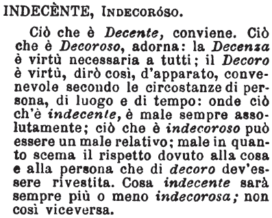 | Indecente, Indecoroso - Ciò che è Decente, conviene. Ciò che è Decoroso, adorna: la Decenza è virtù necessaria a tutti; il Decoro è virtù, dirò così, d'apparato, convenevole secondo le circostanze di persona, di luogo e di tempo: onde ciò ch'è indecente, è male sempre assolutamente; ciò che è indecoroso può essere un male relativo; male in quanto scema il rispetto dovuto alla cosa e alla persona che di decoro dev'essere rivestita. Cosa indecente sarà sempre più o meno indecorosa; non così viceversa. [immagine] |