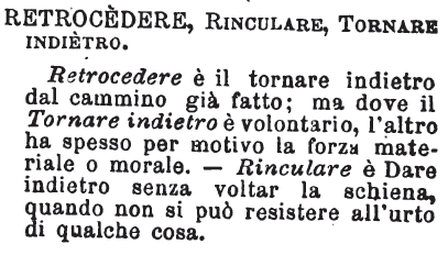 | Retrocedere, Rinculare, Tornare indietro - Retrocedere è il tornare indietro dal cammino già fatto; ma dove il Tornare indietro è volontario, l'altro ha spesso per motivo la forza materiale o morale. Rinculare è Dare indietro senza voltar la schiena, quando non si può resistere all'urto di qualche cosa. [immagine] |