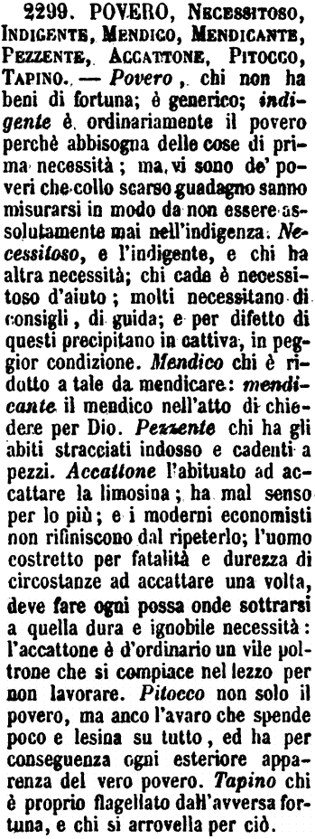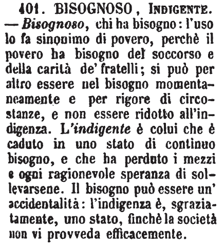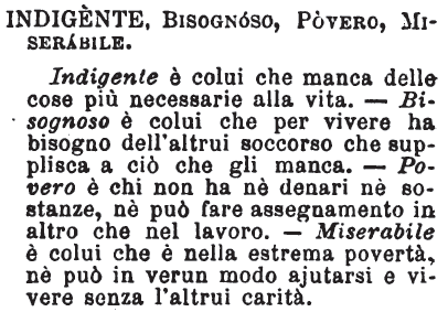 | Indigente, Bisognoso, Povero, Miserabile - Indigente è colui che manca delle cose più necessarie alla vita. - Bisognoso è colui che per vivere ha bisogno dell'altrui soccorso che supplisca a ciò che gli manca. -Povero è chi non ha né denari né sostanze, né può fare assegnamento in altro che nel lavoro. - Miserabile è colui che è nella estrema povertà, né può in verun modo ajutarsi e vivere senza l'altrui carità. [immagine] |