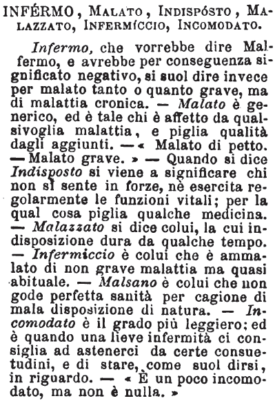 | Infermo, Malato, Indisposto, Malazzato, Infermiccio, Incomodato - Infermo, che vorrebbe dire Malfermo, e avrebbe per conseguenza significato negativo, si suol dire invece per malato tanto o quanto grave, ma di malattia cronica. - Malato è generico, ed è tale chi è affetto da qualsivoglia malattia, e piglia qualità dagli aggiunti. - «Malato di petto. - Malato grave.» - Quando si dice Indisposto si viene a significare chi non si sente in forze, nè esercita regolarmente le funzioni vitali; per la qual cosa piglia qualche medicina. - Malazzato si dice colui, la cui indisposizione dura da qualche tempo. - Infermiccio è colui che è ammalato di non grave malattia ma quasi abituale. - Malsano è colui che non gode perfetta sanità per cagione di mala disposizione di natura. - Incomodato è il grado più leggiero; ed è quando una lieve infermità ci consiglia ad astenerci da certe consuetudini, e di stare, come suol dirsi, in riguardo. - «È un poco incomodato, ma non è nulla.» [immagine] |