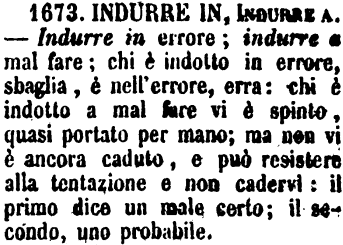 | Indurre in, Indurre a - Indurre in errore; indurre a mal fare; chi è indotto in errore, sbaglia, è nell'errore, erra: chi è indotto a mal fare vi è spinto, quasi portato per mano; ma non vi è ancora caduto, e può resistere alla tentazione e non cadervi: il primo dice un male certo; il secondo, uno probabile. [immagine] |