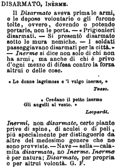 « Le donne lagrimose e 'l vulgo inerme. » Tasso. « Credano il petto inerme Gli augelli al vento. » Leopardi. Inermi, non disarmate, certe piante prive di spine, di aculei o di peli, più specialmente per distinguerle da altre del medesimo genere che ne sono provviste. - Nave - sella - calamíta disarmata, no Inerme. Inerme è per natura; Disarmato, per propria o per altrui volontà. G. F. [immagine] |