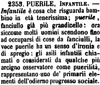 | Puerile, Infantile - Infantile è cosa che risguarda bambino in età tenerissima; puerile, fanciullo già più grandicello: ora siccome molti uomini scendono fino ad occuparsi di cose da fanciulli, la voce puerile ha un senso d'ironia e di spregio: gli asili infantili chiamati o considerati da qualche più arcigno osservatore come puerilità, rappresentano uno de' primarii elementi dell'odierno progresso sociale. [immagine] |