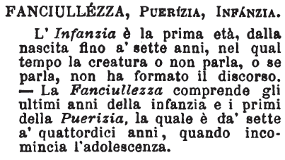 | Fanciullezza, Puerizia, Infanzia - L'Infanzia è la prima età, dalla nascita fino a' sette anni, nel qual tempo la creatura o non parla, o se parla, non ha formato il discorso. - La Fanciullezza comprende gli ultimi anni della infanzia e i primi della Puerizia, la quale è da' sette a' quattordici anni, quando incomincia l'adolescenza. [immagine] |