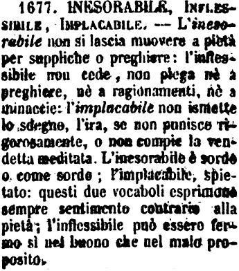 | Inesorabile, Inflessibile, Implacabile - L'inesorabile non si lascia muovere a pietà per suppliche o preghiere: l'inflessibile non cede, non piega nè a preghiere, nè a ragionamenti, nè a minaccie: l'implacabile non ismette lo sdegno, l'ira, se non punisce rigorosamente, o non compie la vendetta meditata. L'inesorabile è sordo o come sordo; l'implacabile, spietato: questi due vocaboli esprimono sempre sentimento contrario alla pietà; l'inflessibile può essere fermo sì nel buono che nel malo proposito. [immagine] |