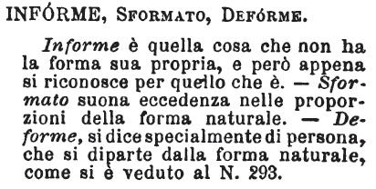 | Informe, Sformato, Deforme - Informe è quella cosa che non ha la forma sua propria, e però appena si riconosce per quello che è. - Sformato suona eccedenza nelle proporzioni della forma naturale. - Deforme, si dice specialmente di persona, che si diparte dalla forma naturale, come si è veduto al N. 293. [immagine] |