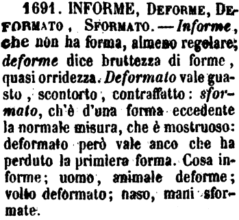 | Informe, Deforme, Deformato, Sformato - Informe, che non ha forma, almeno regolare; deforme dice bruttezza di forme, quasi orridezza. Deformato vale guasto, scontorto, contraffatto: sformato, ch'è d'una forma eccedente la normale misura, che è mostruoso: deformato però vale anco che ha perduto la primiera forma. Cosa informe; uomo, animale deforme; volto deformato; naso, mani sformate. [immagine] |