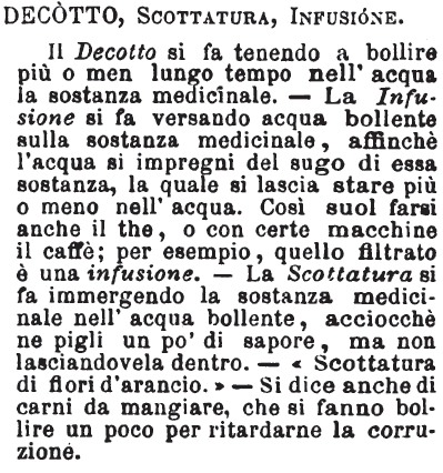 | Decotto, Scottatura, Infusione - Il Decotto si fa tenendo a bollire più o men lungo tempo nell'acqua la sostanza medicinale. - La Infusione si fa versando acqua bollente sulla sostanza medicinale, affinchè l'acqua si impregni del sugo di essa sostanza, la quale si lascia stare più o meno nell'acqua. Così suol farsi anche il the, o con certe macchine il caffè; per esempio, quello filtrato è una infusione. - La Scottatura si fa immergendo la sostanza medicinale nell'acqua bollente, acciocchè ne pigli un po' di sapore, ma non lasciandovela dentro. - «Scottatura di fiori d'arancio.» - Si dice anche di carni da mangiare, che si fanno bollire un poco per ritardarne la corruzione. [immagine] |