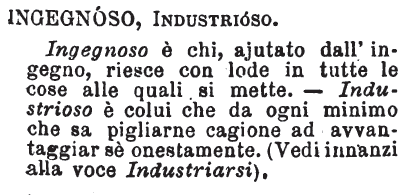 | Ingegnoso, Industrioso - Ingegnoso è chi, ajutato dall'ingegno, riesce con lode in tutte le cose alle quali si mette. - Industrioso è colui che da ogni minimo che sa pigliarne cagione ad avvantaggiar sè onestamente. (Vedi innanzi alla voce Industriarsi). [immagine] |