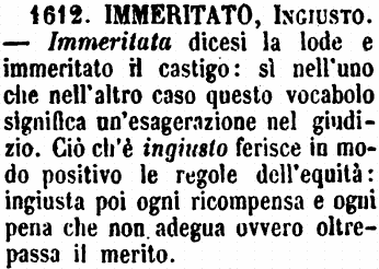| Immeritato, Ingiusto - Immeritata dicesi la lode e immeritato il castigo: sì nell'uno che nell'altro caso questo vocabolo significa un'esagerazione nel giudizio. Ciò ch'è ingiusto ferisce in modo positivo le regole dell'equità: ingiusta poi ogni ricompensa e ogni pena che non adegua ovvero oltrepassa il merito. [immagine] |