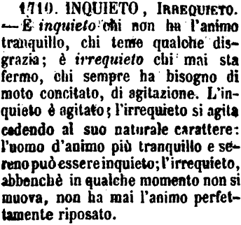 | Inquieto, Irrequieto - E' inquieto chi non ha l'animo tranquillo, chi teme qualche disgrazia; è irrequieto chi mai sta fermo, chi sempre ha bisogno di moto concitato, di agitazione. L'inquieto è agitato; l'irrequieto si agita cedendo al suo naturale carattere: l'uomo d'animo più tranquillo e sereno può essere inquieto; l'irrequieto, abbenchè in qualche momento non si muova, non ha mai l'animo perfettamente riposato. [immagine] |