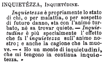 | Inquiettezza, Inquietudine - Inquietezza è propriamente lo stato di chi, o per malattia, o per sospetto di futuro danno, sta con l'animo turbato, nè sa trovar quiete. - Inquietudine è più specialmente l'effetto che fa l'inquietezza sull'animo nostro; e anche la cagione che la muove. - «Ho un monte di inquietudini, che mi tengono in continua inquietezza.» [immagine] |