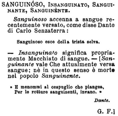 Sanguinoso, Insanguinato, Sanguinante, Sanguinente - Sanguinoso accenna a sangue recentemente versato, come disse Dante di Carlo Senzaterra: