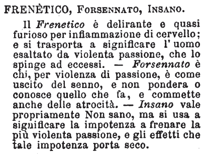 | Frenetico, Forsennato, Insano - Il Frenetico è delirante e quasi furioso per infiammazione di cervello; e si trasporta a significare l'uomo esaltato da violenta passione, che lo spinge ad eccessi. - Forsennato è chi, per violenza di passione, è come uscito del senno, e non pondera o conosce quello che fa, e commette anche delle atrocità. - Insano vale propriamente Non sano, ma si usa a significare la impotenza a frenare la più violenta passione, e gli effetti che tale impotenza porta seco. [immagine] |
