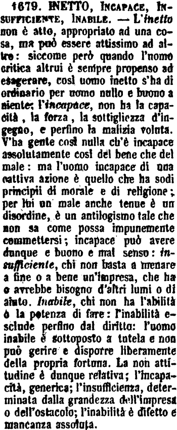| Inetto, Incapace, Insufficiente, Inabile - L'inetto non è atto, appropriato ad una cosa, ma può essere attissimo ad altro: siccome però quando l'uomo critica altrui è sempre propenso ad esagerare, così uomo inetto s'ha di ordinario per uomo nullo e buono a niente; l'incapace, non ha la capacità, la forza, la sottigliezza d'ingegno, e perfino la malizia voluta. V'ha gente così nulla ch'è incapace assolutamente così del bene che del male: ma l'uomo incapace di una cattiva azione è quello che ha sodi principii di morale di religione; per lui un male anche tenue è un disordine, è un antilogismo tale che non sa come possa impunemente commettersi; incapace può avere dunque e buono e mal senso: insufficiente, chi non basta a menare a fine o a bene un'impresa, che ha o avrebbe bisogno d'altri lumi o di aiuto. Inabile, chi non ha l'abilità o la potenza di fare: l'inabilità esclude perfino dal diritto: l'uomo inabile è sottoposto a tutela e non può gerire e disporre liberamente della propria fortuna. La non attitudine è dunque relativa; l'incapacità, generica; l'insufficienza, determinata dalla grandezza dell'impresa o dell'ostacolo; l'inabilità è difetto e mancanza assoluta. [immagine] |