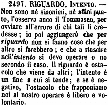 | Riguardo, Intento - Non sono nè sinonimi, nè affini punto, l'osserva anco il Tommaseo, per ovviare all'errore di chi tali li credesse; io poi aggiungerò che per riguardo non si fanno cose che per altro si farebbero; e che a riuscire nell'intento si deve operare o no secondo il caso. Il riguardo è ostacolo che viene da altri; l'intento è un fine a cui si tende; e se è negativo, l'ostacolo che frapponiamo noi al nostro operare è libero e volontario. [immagine] |