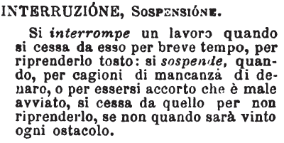 | Interruzione, Sospensione - Si interrompe un lavoro quando si cessa da esso per breve tempo, per riprenderlo tosto: si sospende, quando, per cagioni di mancanza di denaro, o per essersi accorto che è male avviato, si cessa da quello per non riprenderlo, se non quando sarà vinto ogni ostacolo. [immagine] |