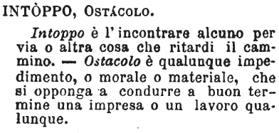 | Intoppo, Ostacolo - Intoppo è l'incontrare alcuno per via o altra cosa che ritardi il cammino. - Ostacolo è qualunque impedimento, o morale o materiale, che si opponga a condurre a buon termine una impresa o un lavoro qualunque. [immagine] |